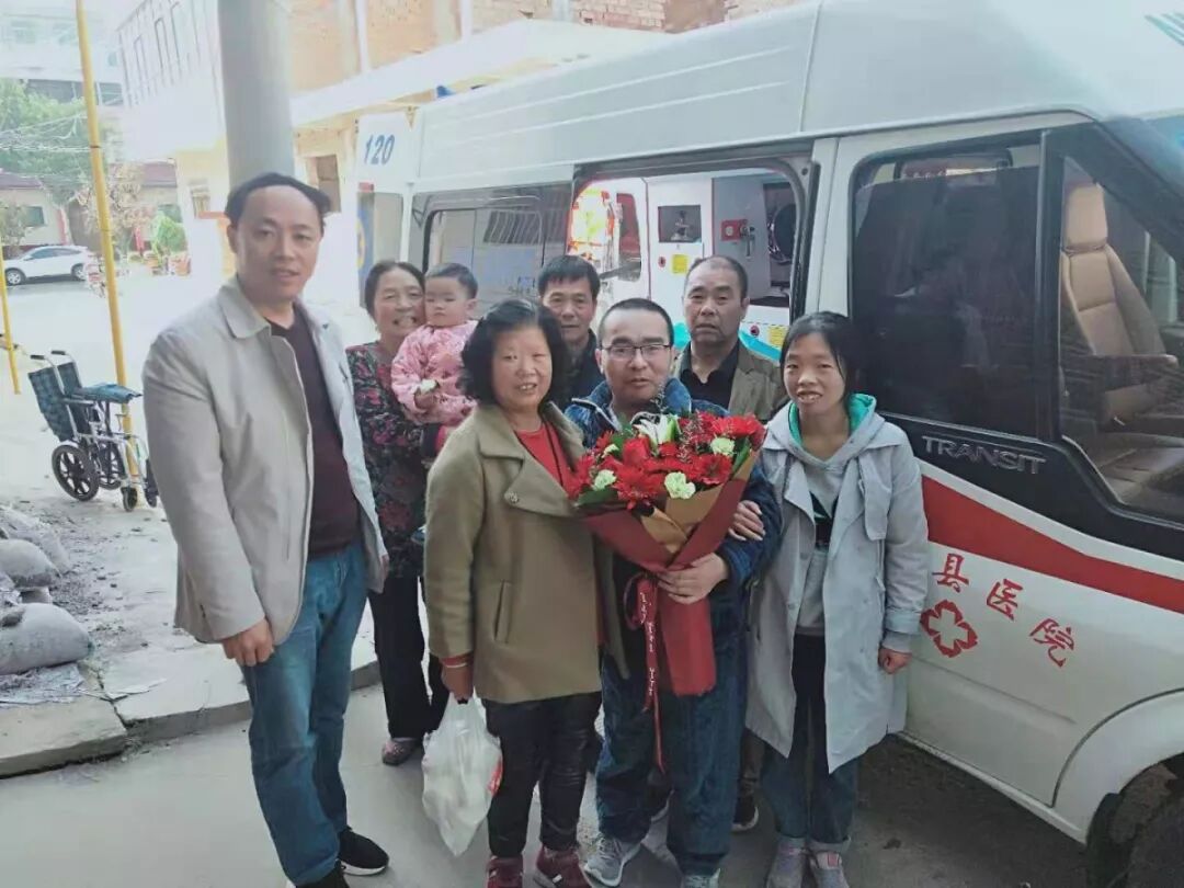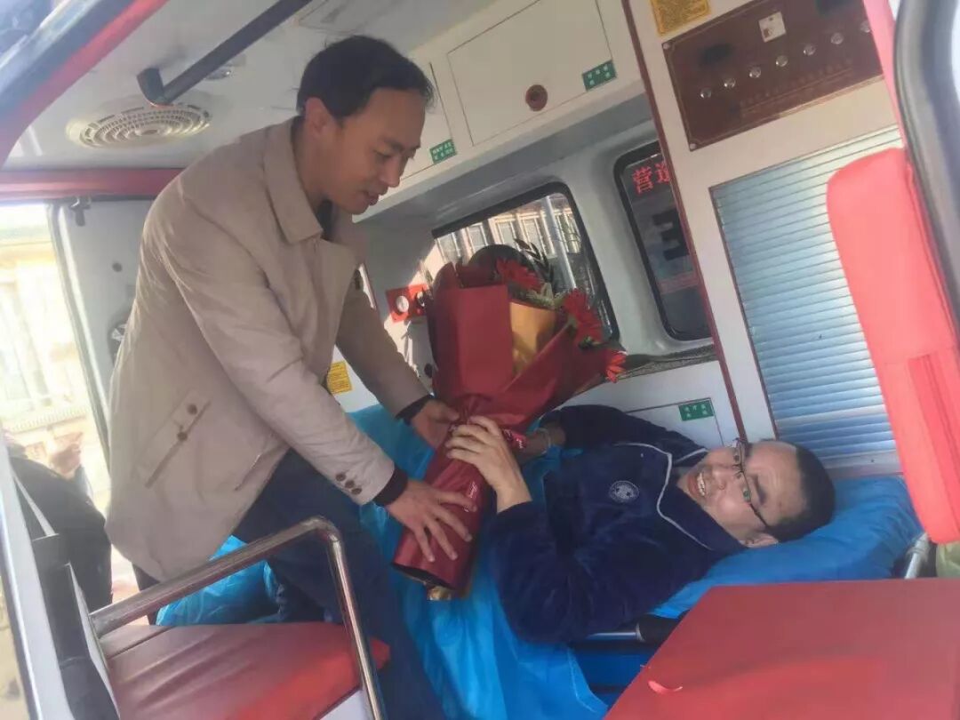 回程的车上,康复疼痛科张峰主任为郑伟献上鲜花,并送上院领导及全院同事的期盼与祝福,致敬我们泾医可爱的战士,我们带你回家!