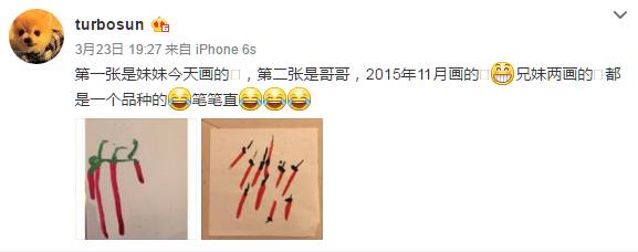 然而,她从来也没有晒过等等“被修改后的画”,甚至,她更喜欢兄妹俩“天真幼稚”的画作创作,并发博表示鼓励和欣赏。