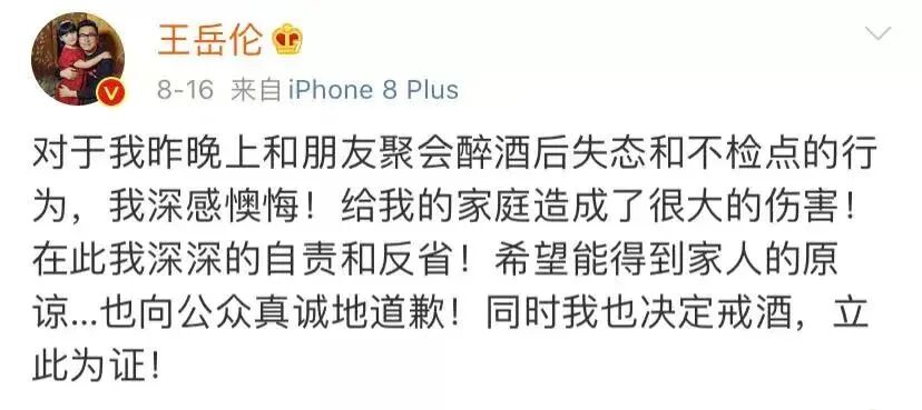 事后,王岳伦发文请求大众和家人的原谅,信誓旦旦决定戒酒,还写下了保证书为证。
