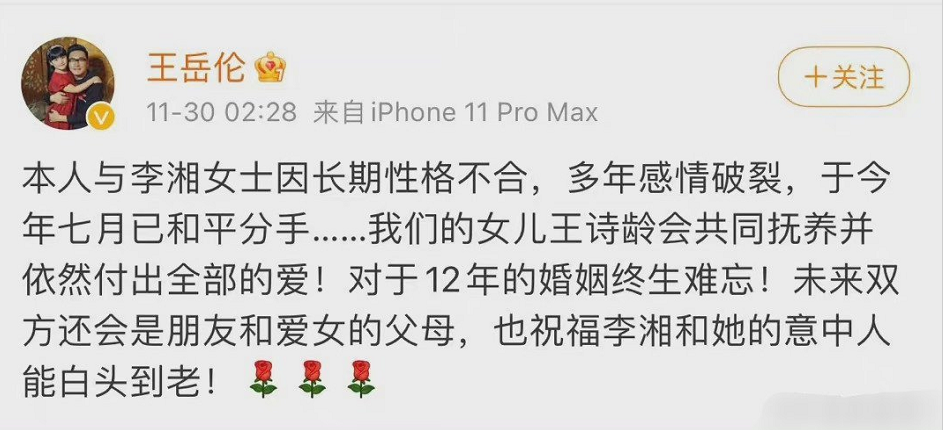今天凌晨,王岳伦宣布离婚后秒删!内涵李湘也有男人!