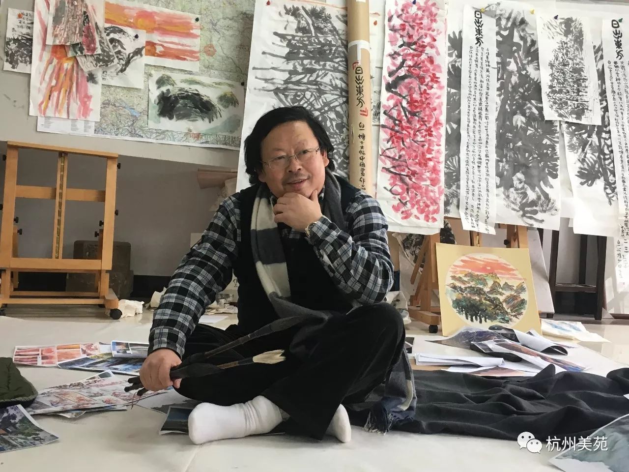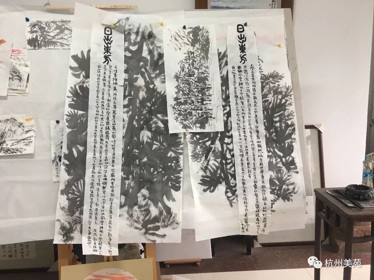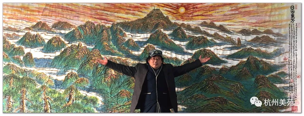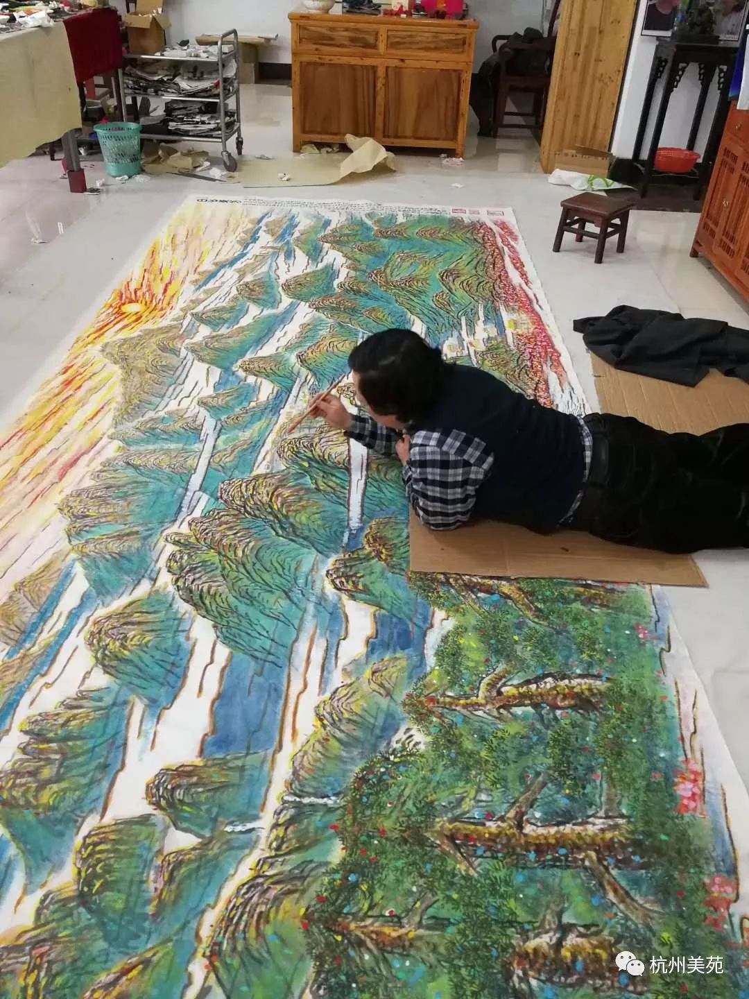 岁末最寒冷的一天,白一博士完成了他历时三个月的《日出东方》。画完成的那天,他开始畏寒、发热、咳嗽,这三个月,从一张白纸酝酿、寥寥数笔勾勒到挥毫泼墨创作、不断研究修改。今年冬天,杭州阴冷,他在没有空调的画室里常常一画就是十几个小时,画太大了,他把纸铺在地上,他蹲着,跪着、趴着,在冰冷的地上一笔一笔画出了长5米、高1.93米的巨幅青绿山水画《日出东方》。在创作中期,白一博士为突出泰山的气势磅礴,在借鉴其他艺术家绘画泰山的基础上不断创新,一遍遍的修改和完善,力求完美。由此可见白一博士对艺术的高要求,高标准。