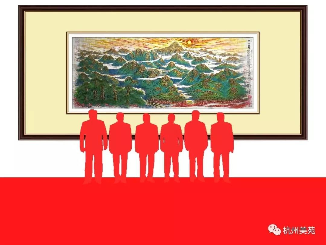 “建”画的创意来自62年前的《和平颂》,这幅画为了与1955年的《和平颂》拉开距离,选用泰山作为远山做配景,又借鉴了傅抱石、关山月创作的《江山如此多娇》,看过两幅作品的观众,一眼可以看出距离确实被拉开,何止落后六十几年。