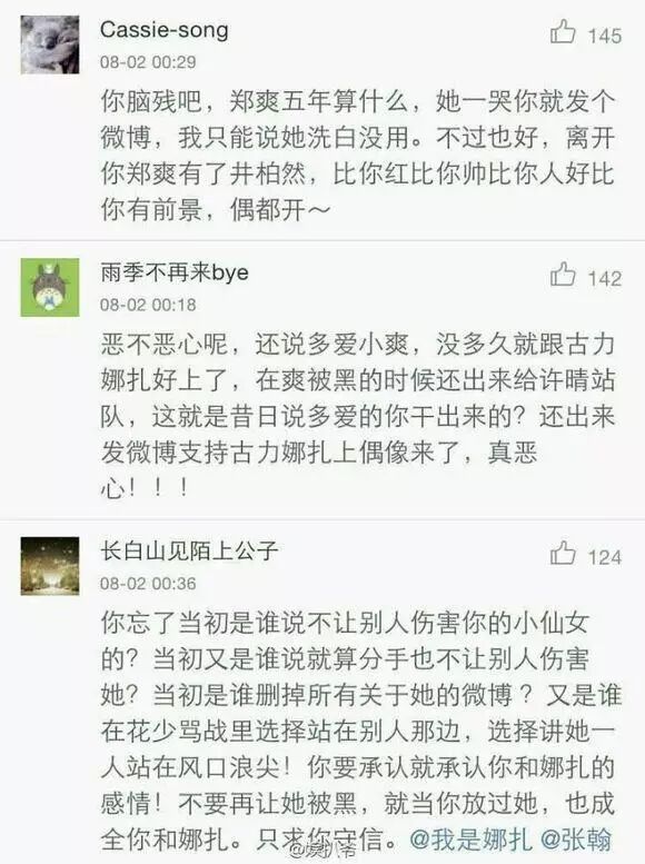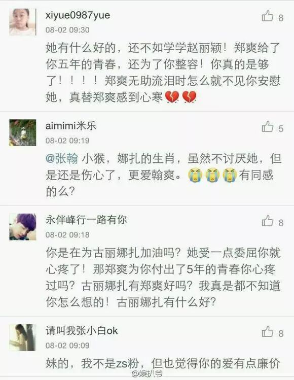 唉~小便想说:真是实在的孩子,为爱整容,弄得最后修不成正果! 直到分手,还在为张翰抱不平的爽姐至于外界一直传言有第三者介入,郑爽几乎是立刻否认,她说:“我觉得我们之间应该没有第三者,我认识的张翰是个非常专一的男生。”而去年张翰在微博上发了一张意味不明的弹琴照片,虽然粉丝们猜测这是张翰对郑爽余情未了,但是“翰爽恋”无疾而终已是不争的事实。