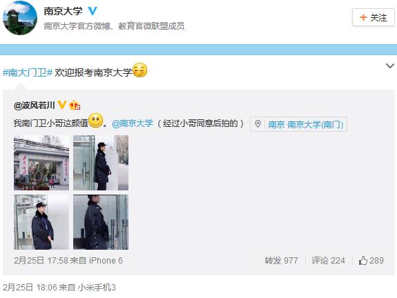 “颜值爆表!南大门卫小哥帅哭网友!”近日,南京大学官方微博上晒了组网友“@波风若川”拍的门卫小哥照片。有人说他像盛一伦、赵又廷、井柏然,还有人说像刘恺威。随即就有网友感慨说:“现在门卫竞争都这么激烈了吗?”还有网友表示,“想再选一次大学!”这个门卫小哥到底有多帅?昨天傍晚,记者前往南大鼓楼校区汉口路大门口一探究竟。