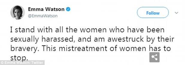 一直在为女权努力的艾玛,也于今日表态:我支持所有曾经受过性骚扰的女性,并且惊叹她们现在站出来的勇气。这种对于女性的不公正行为是时候该停止了。