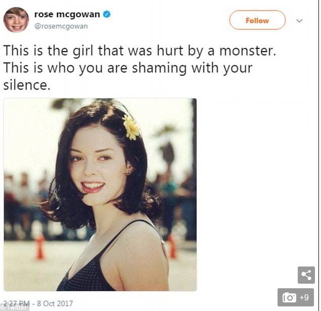 根据《纽约时报》报道,罗丝·麦高恩在受到温斯坦的骚扰后,选择私下和解,拿了10万美金作为和解费用。