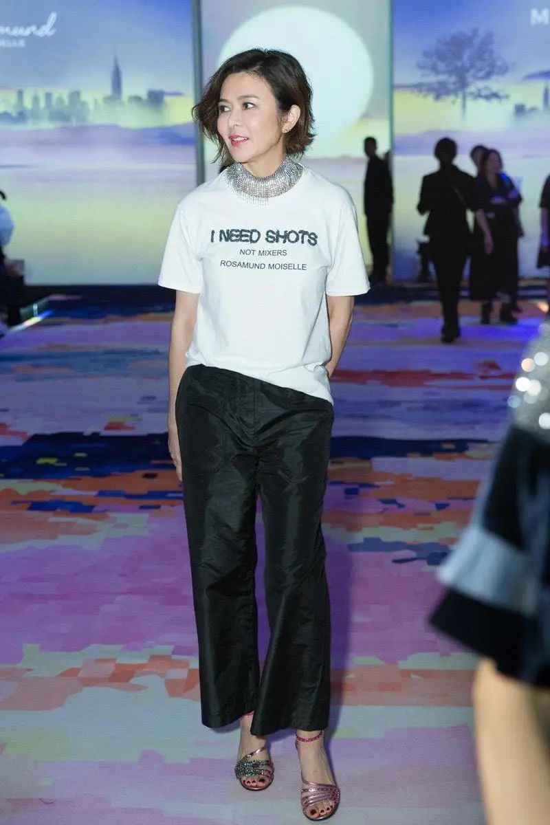 关之琳穿的这一件白色的短袖还是非常的简约图案不会有太多,搭配这一条黑色裤子还是非常好看的。果然还是关之琳的身材和气质高雅。就这么一套普通的衣服穿在她的身上,居然会有这么好的气质。