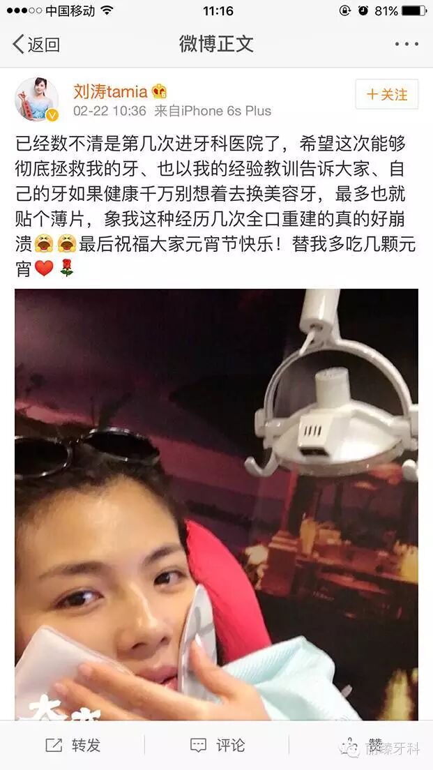 2月22日,刘涛在微博中晒出一张自拍,躺在牙椅上的她,捂着两颊,表情很是痛苦,并发文表示,自己已经数不清是第几次进牙科医院了,经历几次全口重建后,牙齿太崩溃了,用自己的切身经历奉劝网友:“牙如果健康千万别想着去换美容牙。”