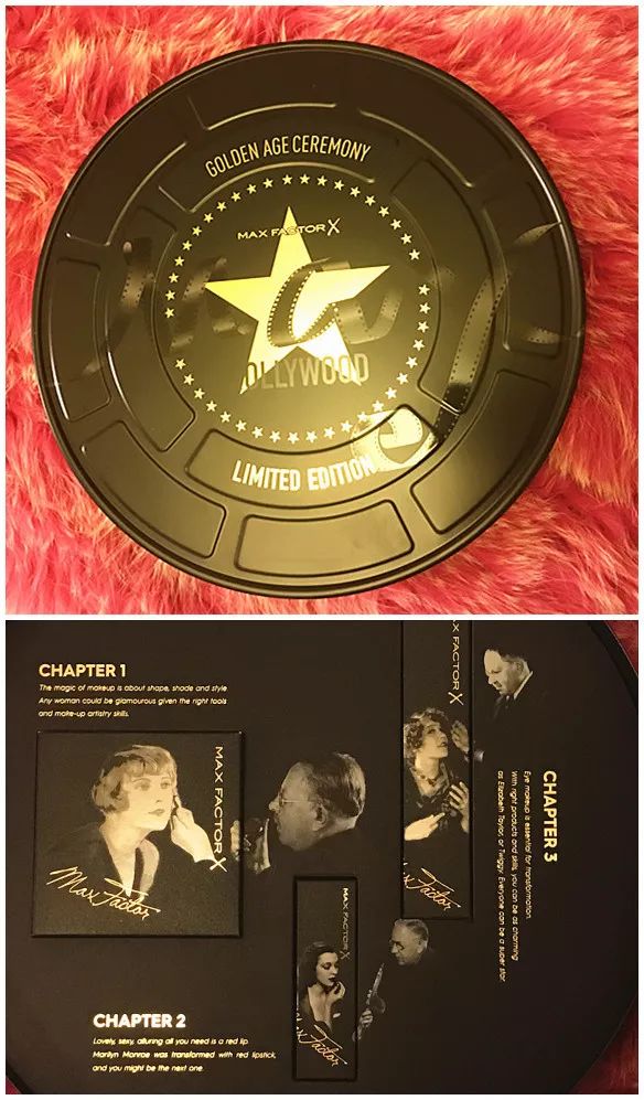 礼盒包装还蛮好玩的,用电影胶片盒装,打开后里面是蜜丝佛陀先生为明星们制定妆容时的场景。单品都是特别设计的包装。