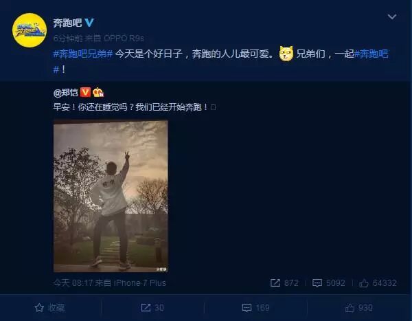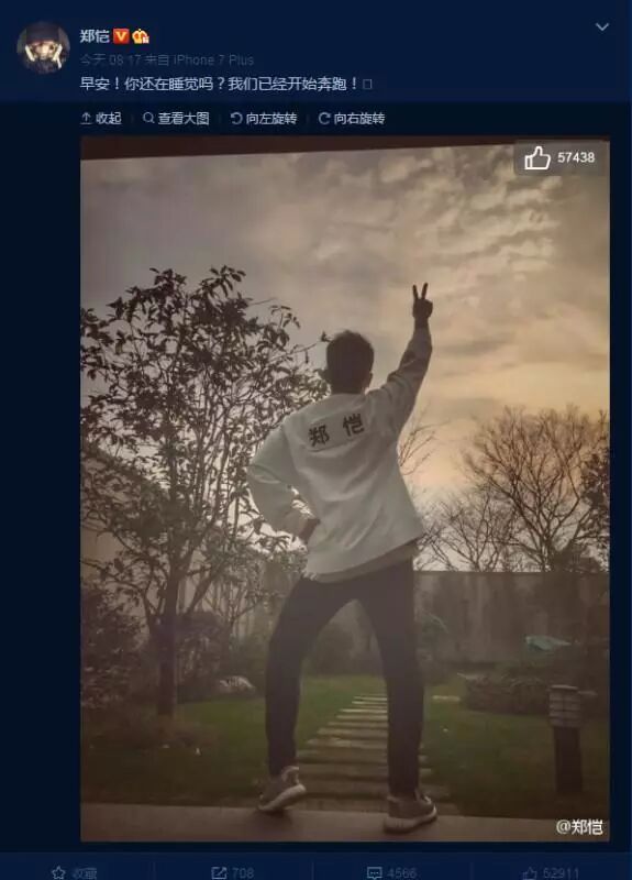 郑恺则紧接着晒出贴着名牌的背影照,称“早安!你还在睡觉吗?我们已经开始奔跑!”