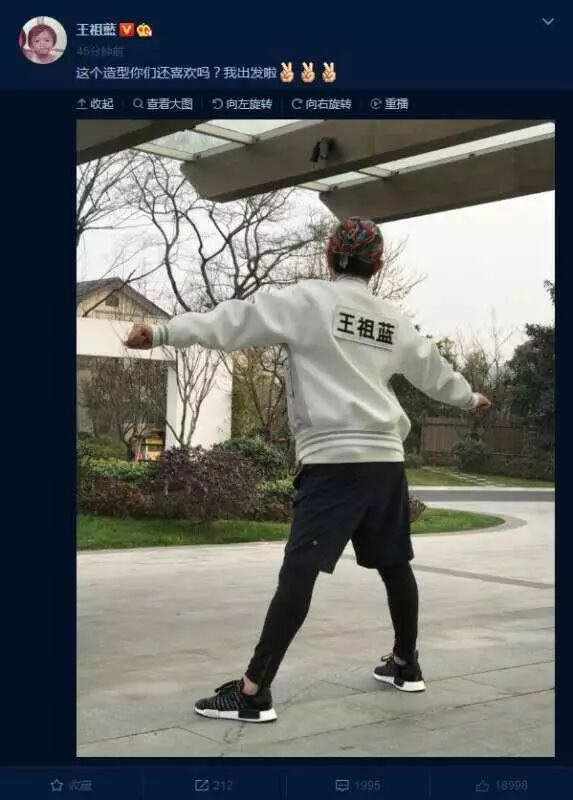 王祖蓝微博写着:这个造型你们还喜欢吗?我出发啦。