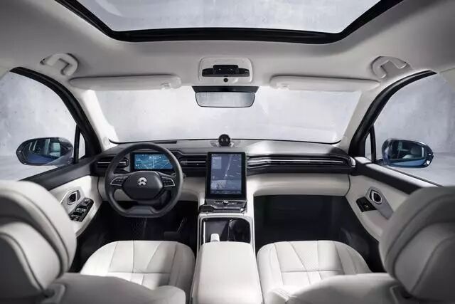 蔚来还在副驾做了一个有脚托,能够大幅度向后挪动和调节倾斜度,能够跟后座的小朋友互动。此外,全车大面积采用真皮,营造出一种头等舱的感觉。
