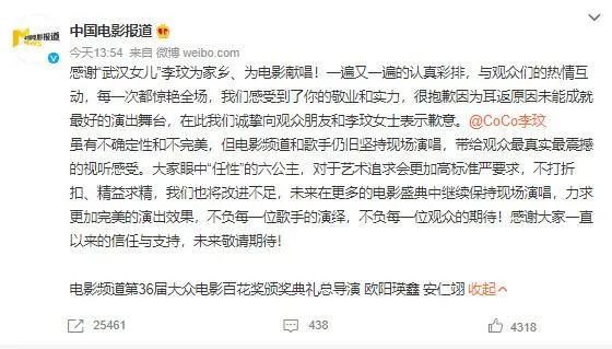李玟道歉后,百花奖颁奖礼总导演安仁翊委托中国电影报道代发文向李玟道歉,在致歉信中,百花奖总导演表示,感谢李玟在一遍一遍认真彩排,很抱歉因为耳返未能成就最好表演。