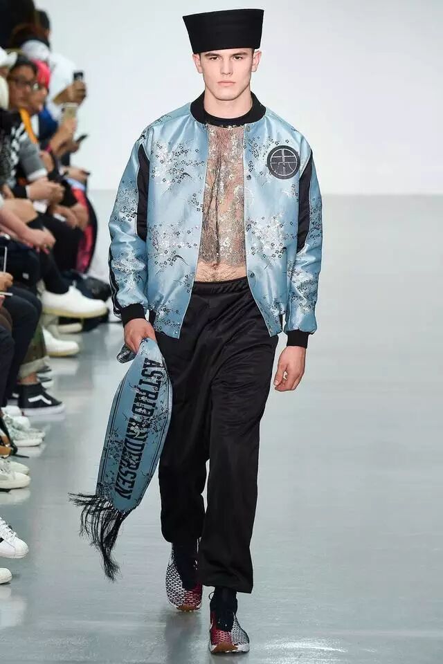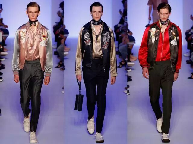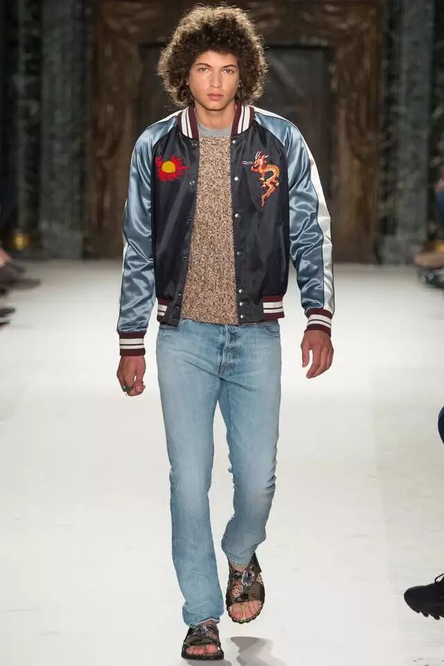 在2016春夏季的伸展台上,我们一方面感受到了铺面而来的东方风情,男装领域已经很久没有挂起“东风”了。另一方面我们惊叹于为何秀场上充斥着图案如此百变复杂的“棒球夹克”。起初,我们仅仅是认为这种美国常春藤文化下的风靡产物再度归来。可当你细看那些所谓的“棒球夹克”上,丝质夹克的前胸、后背、袖口处绣着大量做工复杂考究的立体印花,它们集体带有显眼的东方意象: