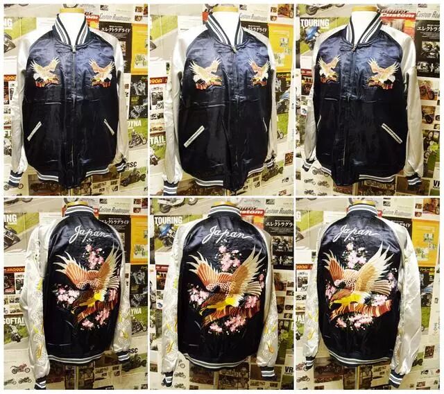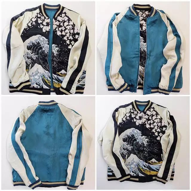 上世纪80年代产的横须贺手信夹克,现在市面大部分横须贺手信夹克都不是以绸缎制作,而改以类近的色丁布作素材,而丝绒亦是另一常用物料。这样奇特的夹克衫就成为了一个新潮的穿搭方式,除了象征了美国的巨鹰,还有深受东方文化影响的龙、鲤鱼等!