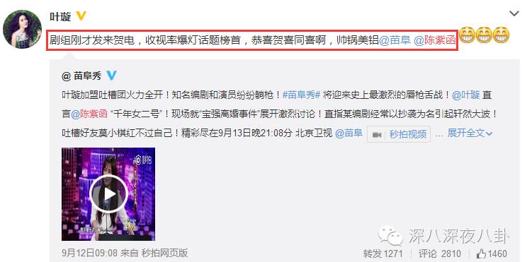 果然,叶璇自己晒出节目收视率高的祝贺。还隔空艾特陈紫函。