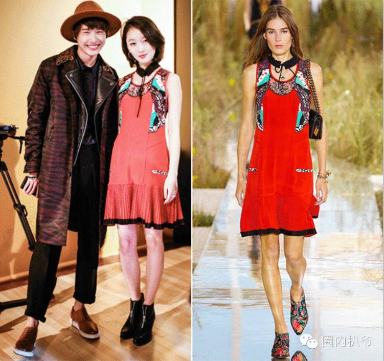 周冬雨身材娇小,典型的东方女性小清新的面孔,她搭配的是富印花元素的连衣裙。