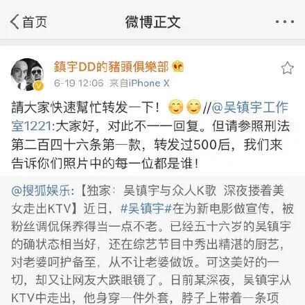 刚爆出不久,吴镇宇及他的工作室就迅速做出了第一波回应:请大家帮忙转发过500,再说明照片里的每一个人是谁