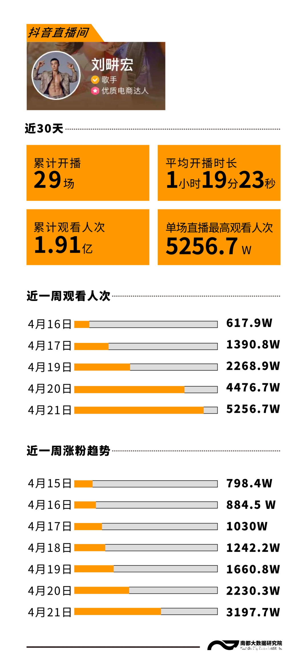 蝉妈妈数据显示,3月23日以来的近30天里,刘畊宏在抖音开播29场,累计观看人次近2亿,4月16日以来,该数据保持稳定增长,并在近一周呈现爆发式增长态势,4月21日(截至发稿前)单场直播达5256.7万观看。而随着指数级增长的曝光量,流量神话在刘畊宏的直播间里仍不断上演。