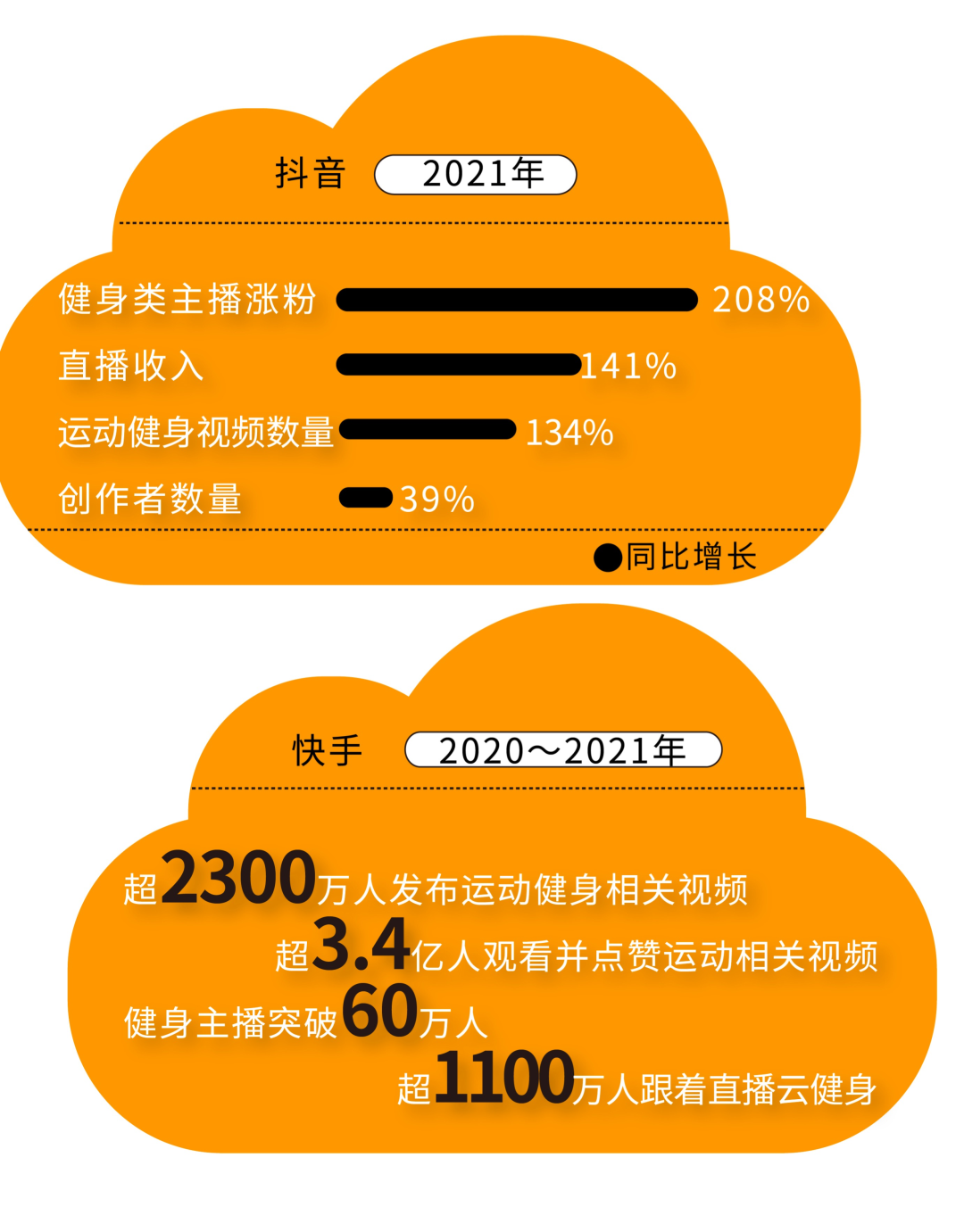 疫情催化了“云健身”兴起,直播拓宽了全民健身的新边界,也加速了一批运动健身内容创作者的养成。3月31日发布的《抖音运动健身报告》显示,2021年,健身类主播涨粉同比增加208% ,直播收入同比增加141%。抖音运动健身视频数量同比增长134%,创作者数量同比增长39%。而据快手2021年公布数据,2020~2021年统计时段内,有超2300万人在快手发布运动健身相关视频,超3.4亿人在快手观看并点赞运动相关视频,在快手直播教大家健身的主播突破60万人,超1100万人跟着直播云健身。