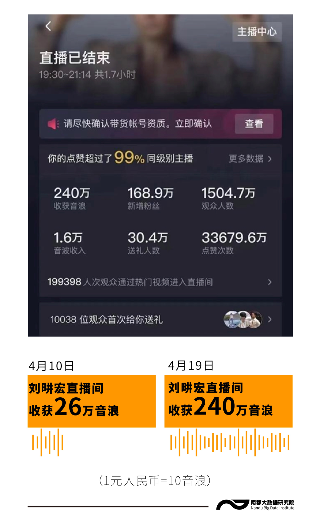刘畊宏的直播间有多吸金?据有关报道,4月10日,刘畊宏直播结束后,收获了26万音浪,4月19日,则收获了240万音浪。按照音浪与人民币10:1的兑换比例,刘畊宏的直播收入从2.6万元涨至24万元,接近10倍增长。如按照平台、mcn机构先后与主播1:1的分成比例,并加上分红奖励,大致换算可得,在24万元的基数下,主播可以拿到近14万元的直播收入(不含税) 。