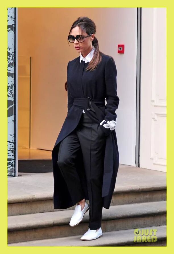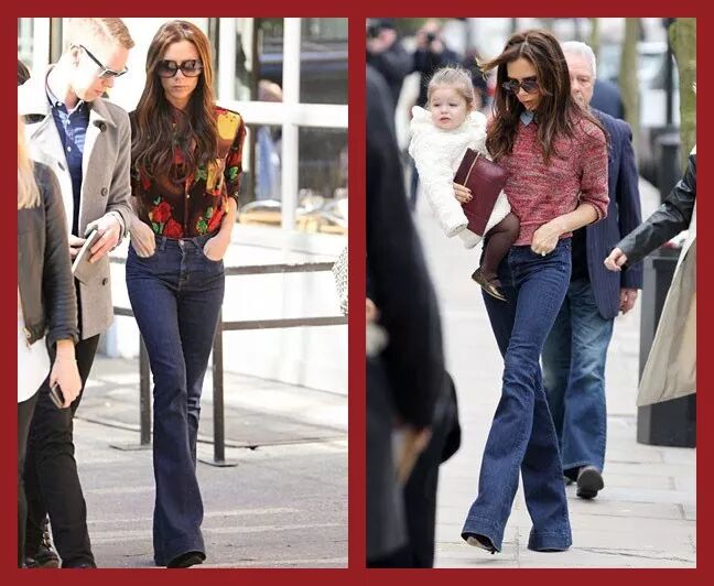 牛仔喇叭裤还有另一个好处就是,让你无形中显高!尤其是长度可以盖住鞋面的款式,配上了高跟鞋之后,整个腿长就蹭蹭地往上涨,想没有长腿都不行~不信你看贝嫂,看上去是不是像有170以上?