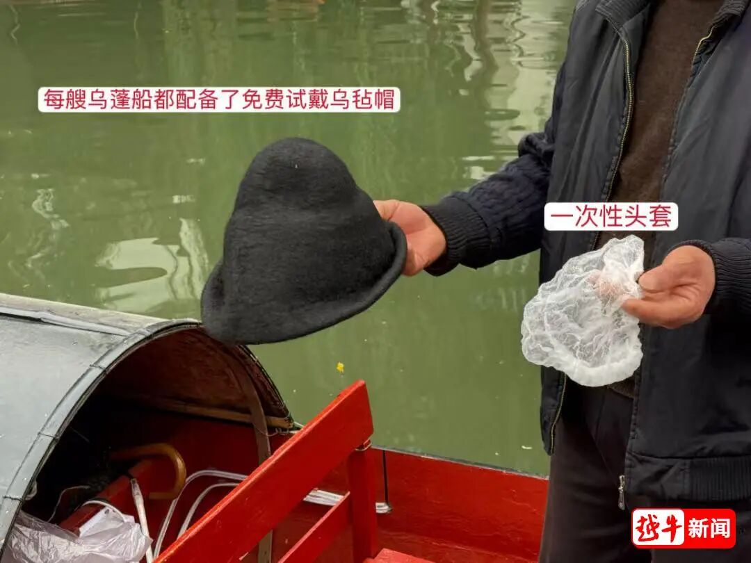 乌篷船工作人员向记者展示乌毡帽免费试戴流程
