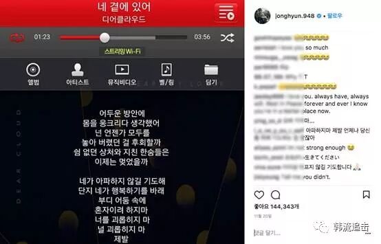 11月20号 钟铉最后的Instagram上,Dear Cloud的 “留在我身边”两节歌词的照片, 还有文字:“祈祷你不痛苦”。