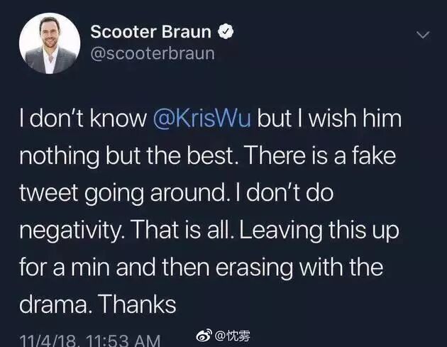 11月5日,经济人Scooter Braun在社交网站上正式发文辟谣,澄清所谓“指责吴亦凡刷榜”一事。