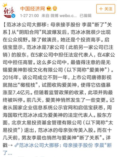 但在今年1月15日,爱美神企业管理的出资人发生了变更,李晨和范冰冰双双退出了爱美神企业管理。