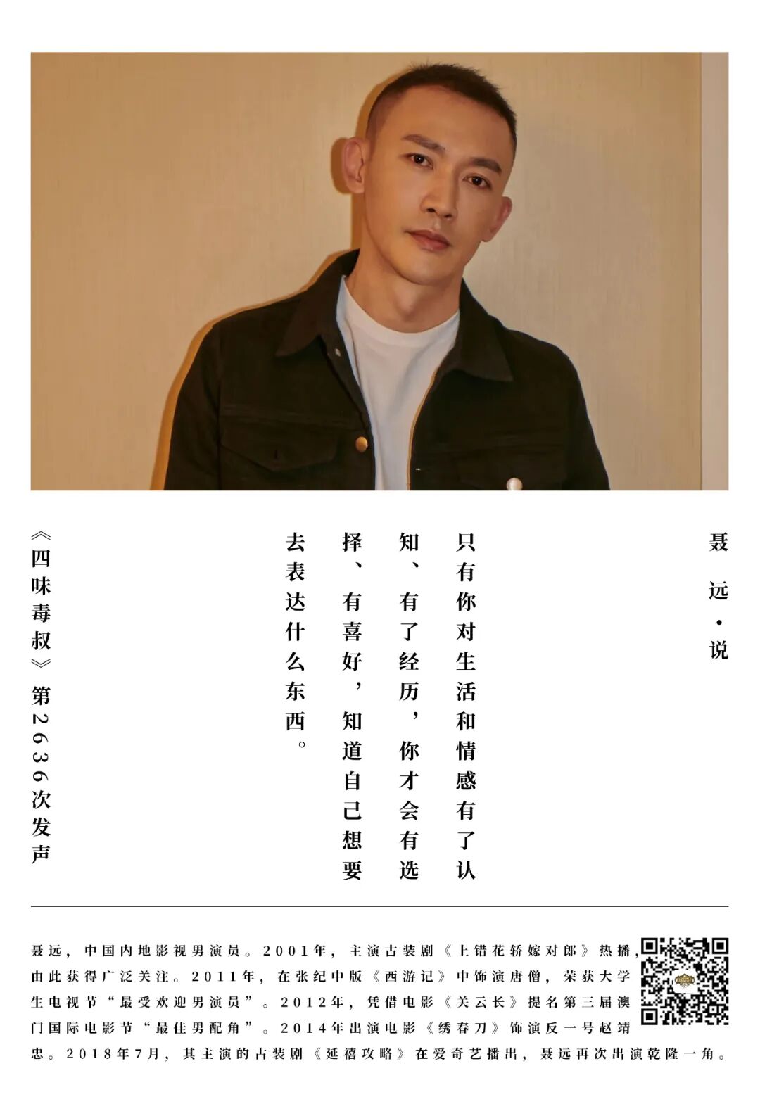 聂远:是的,因为只有你对生活和情感有了认知、有了经历,你才会有选择、有喜好,知道自己想要去表达什么东西。