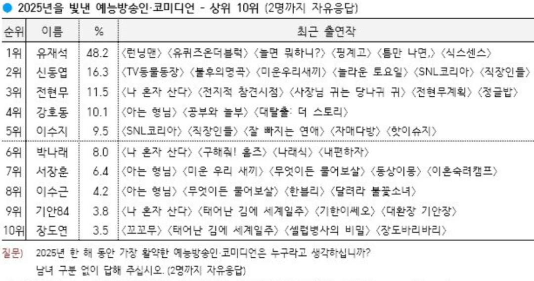 韩国盖洛普于去年11月11日至28日期间,面向全国(济州岛除外)1700名13岁以上民众,询问了“今年最活跃的综艺人·喜剧演员”(自由回答,最多提名两位)。结果显示,刘在石以48.2%的支持率,连续14年位居第一。