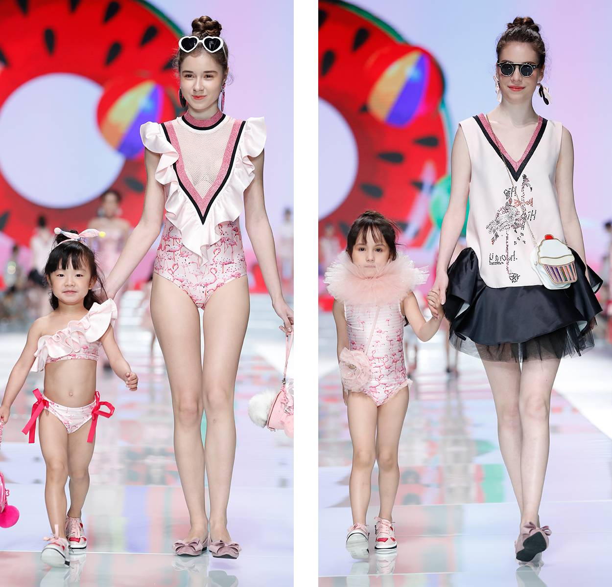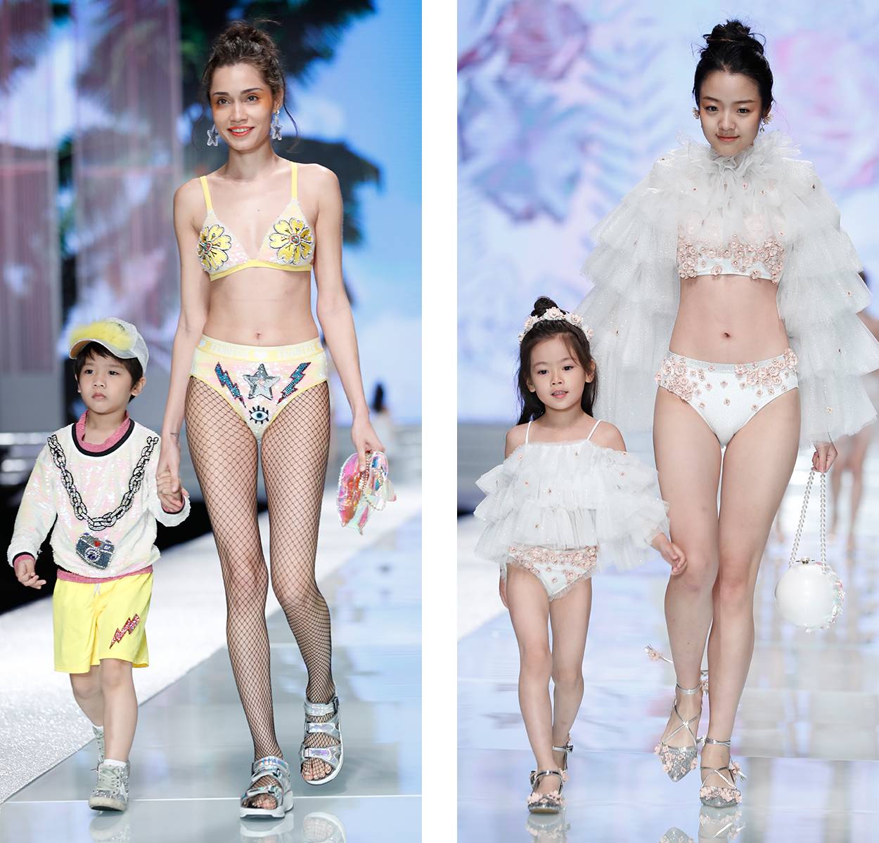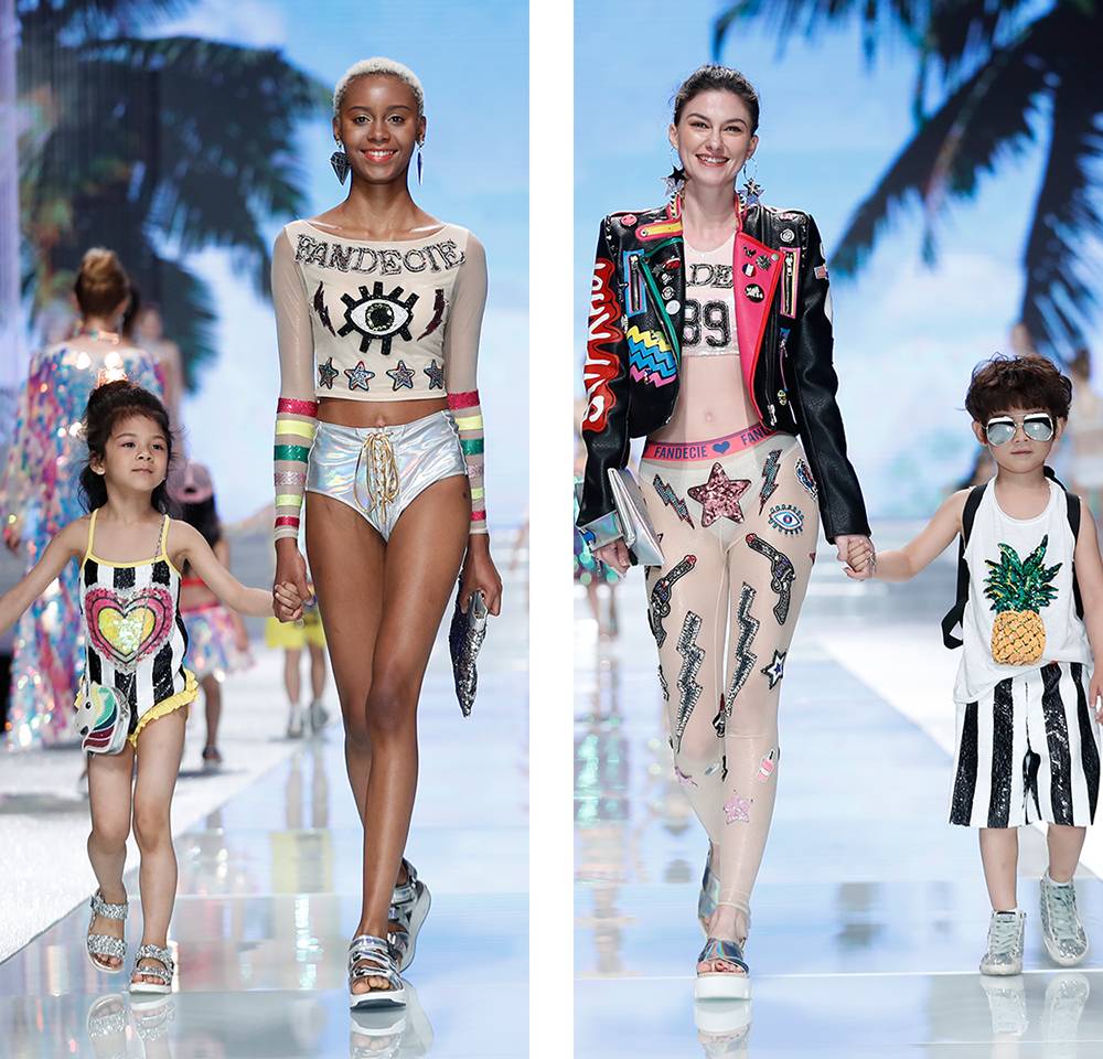 第三个系列亲子时光是全场最萌,穿着俏皮内衣&泳装的模特领着“小超模”们组团走秀。