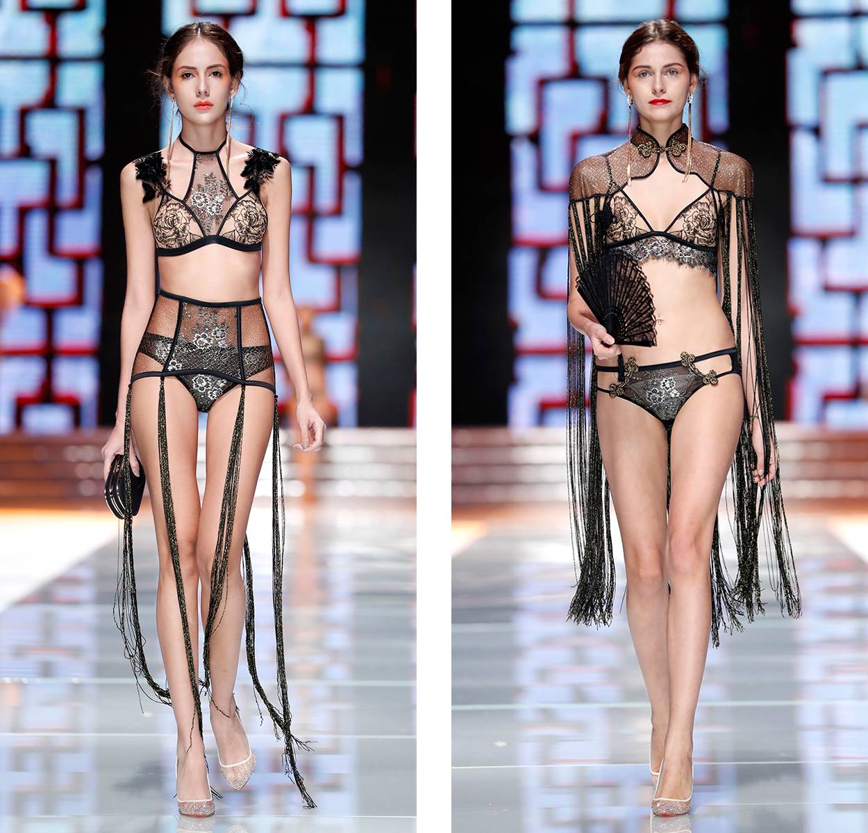 融合内衣风格的改良旗袍,加上神秘性感的黑色流苏,说这场秀是中国版维密一点毛病没有。