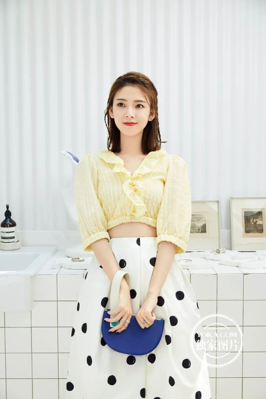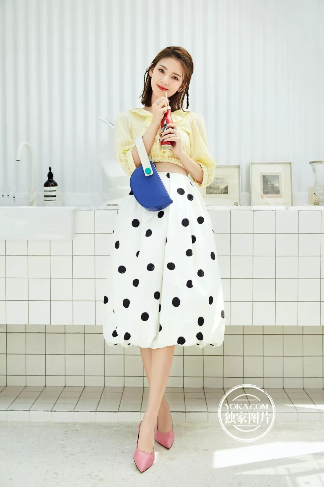 来一只更加小清新的陈瑶吧,白色波点裙和黄色露肚脐上衣搭配在一起,颜色甜美淡雅,手拿蓝色小包,和黄色上衣来了一个小小的撞色,戒指的叠搭也是今年的流行重点,这个“小心机”狠赚眼球哦,满满的元气。