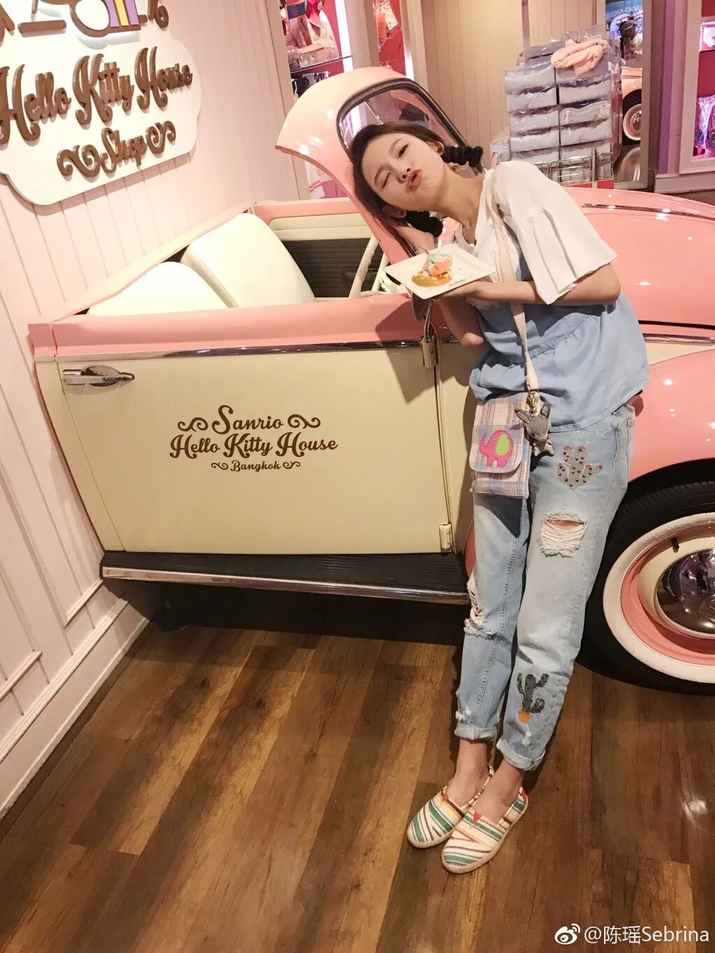 这94年的瑶妹要不要这么可爱呀~拍照都不忘拿着一盘吃的!不管是发型还是刺绣破洞裤、小包包,都充满了童趣,少女心爆棚。