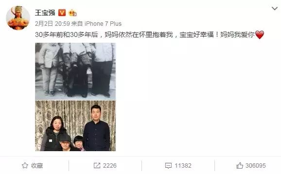 昨晚,王宝强晒30年前后的全家福对比照,并写道:"30多年前和30多年后,妈妈依然在怀里抱着我,宝宝好幸福!妈妈我爱你!"照片中,妈妈带着王宝强姐弟三人,一家人都长得非常像,特别是王宝强和姐姐,两人简直一模一样。