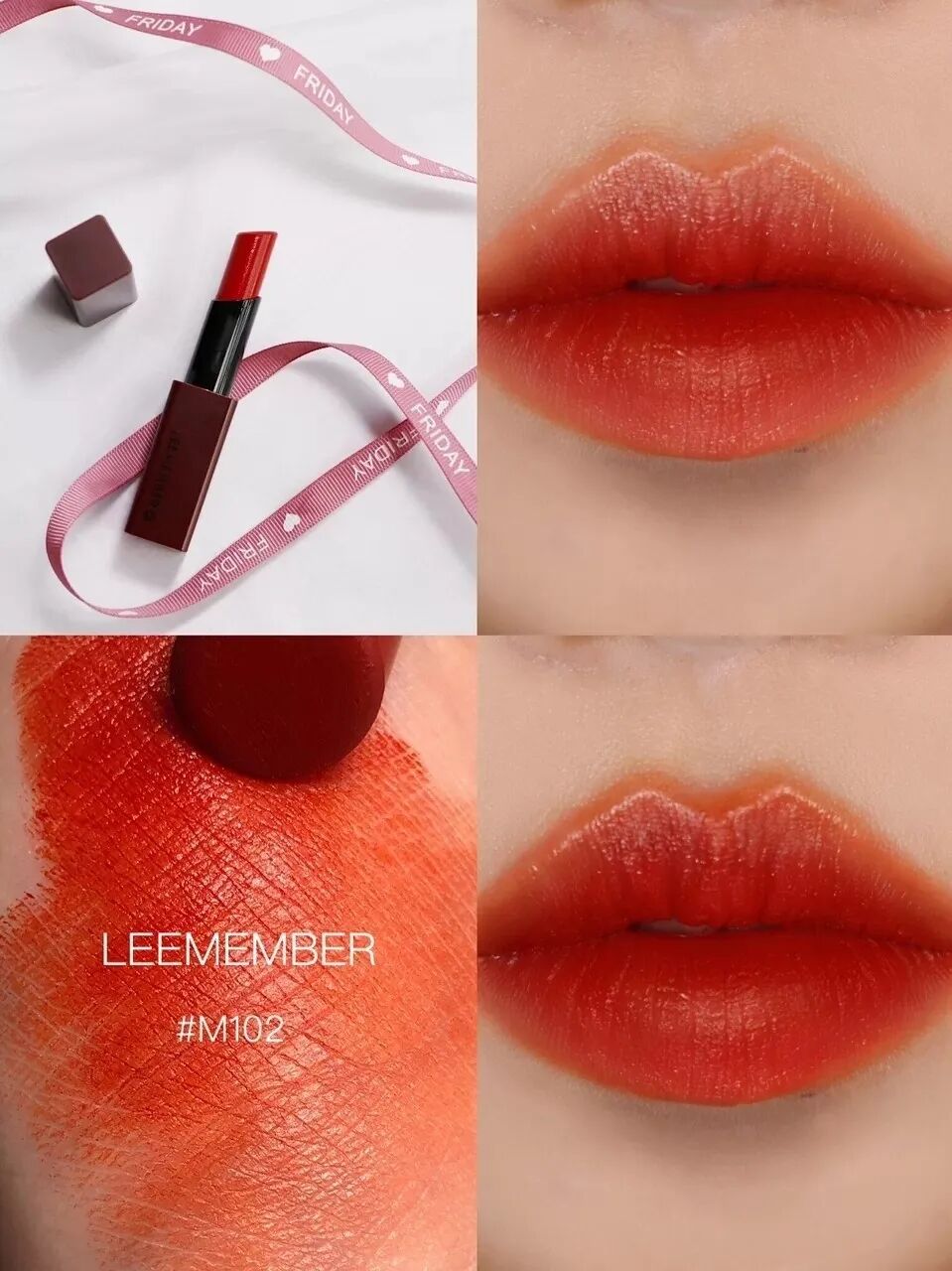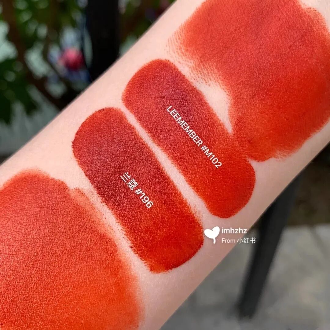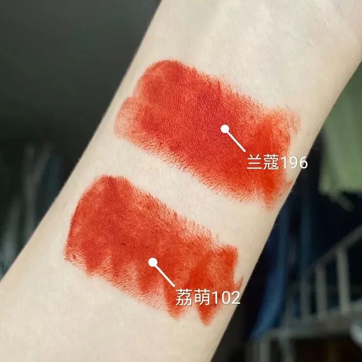 兰蔻196是橘棕色系,薄涂橘色调,厚涂棕色调加重,偏暗。荔萌M102是橘红色系,薄涂橘调,厚涂红调比较多,看起来明亮活泼一些。