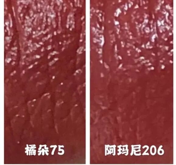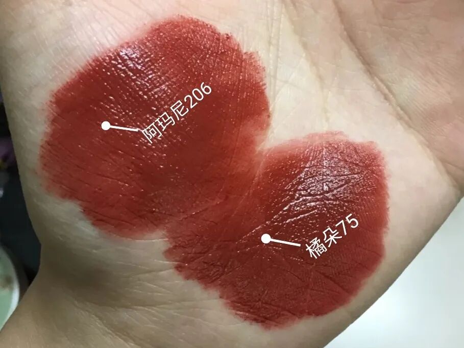 讲真这两支颜色真的比较接近,阿玛尼206给我的感觉是红棕色里加入了一点豆沙调,薄涂温柔,厚涂气质。而橘朵75棕调更加明显,厚涂看起来红棕色更正,也更显成熟。
