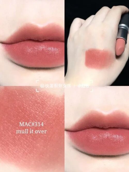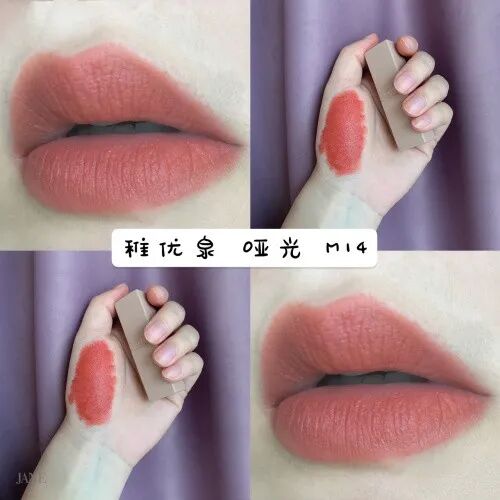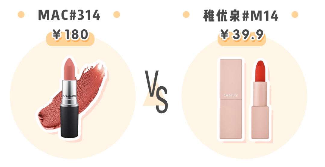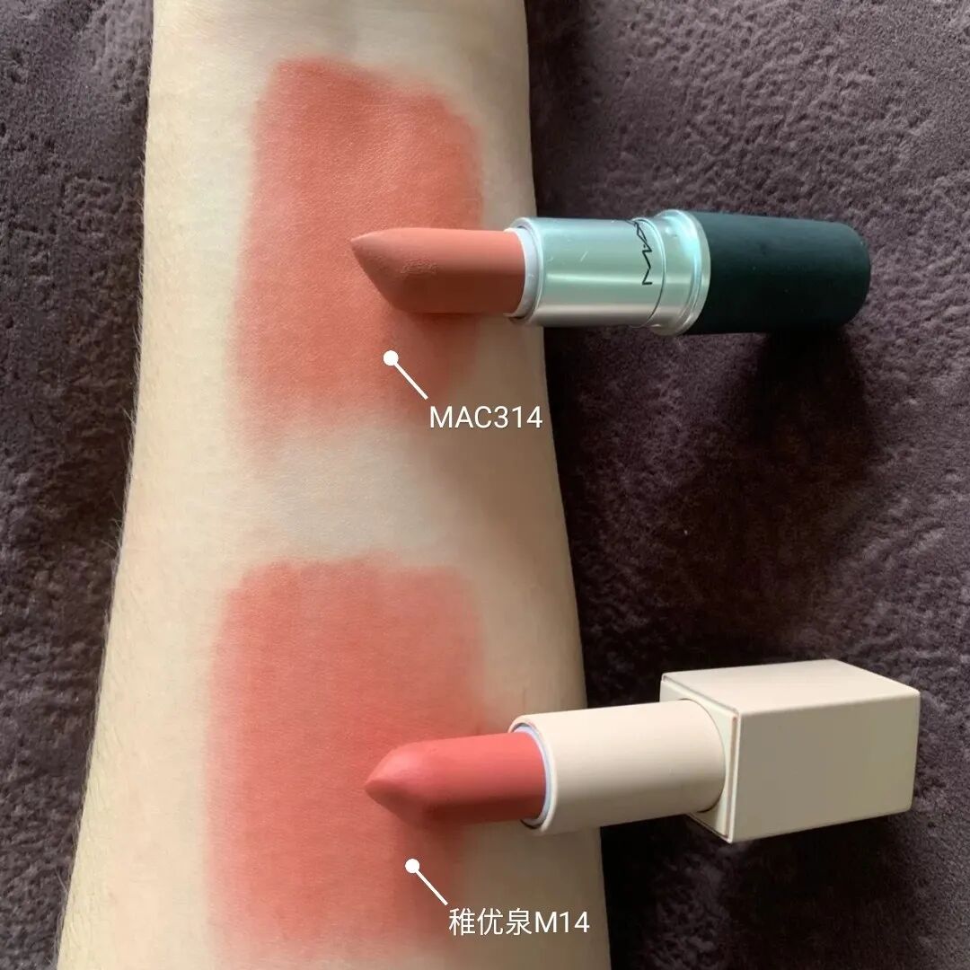 MAC#314偏杏粉奶茶色,稚优泉#M14更红一点,两支口红薄涂比较相似,厚涂稚优泉没有MAC那么浅那么温柔,整体红调会比较重。