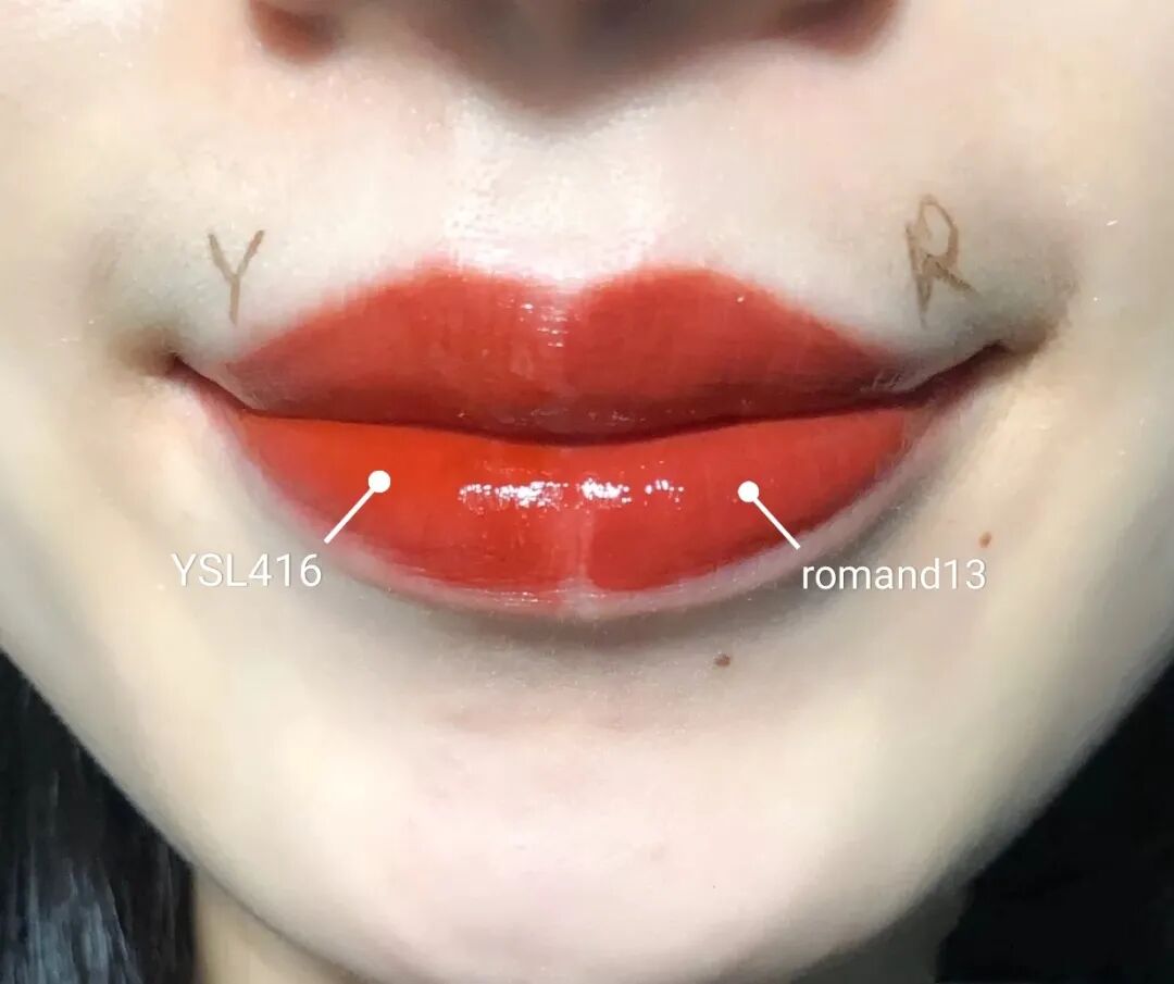 都是烂番茄色,但YSL颜色偏红,romand 13颜色偏橘,薄涂差别不是特别大,厚涂颜色还是有点差别。