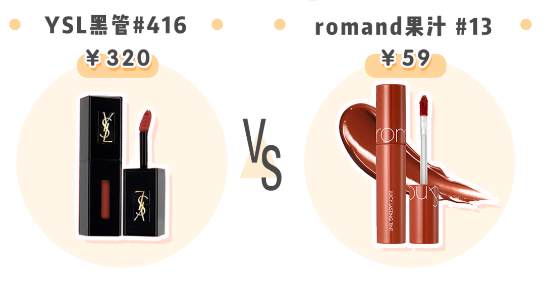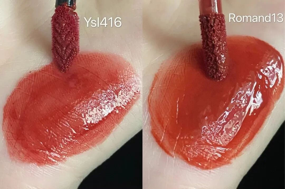 第三组是本黄皮最爱的镜面唇釉YSL 416 VS romand 13,番茄果汁色元气又显嫩,镜面唇釉很容易打造出玻璃唇效果,对唇纹比较深的妹子很友好。