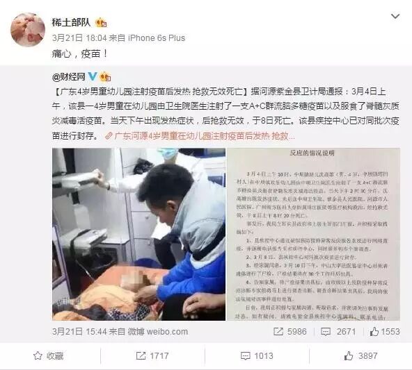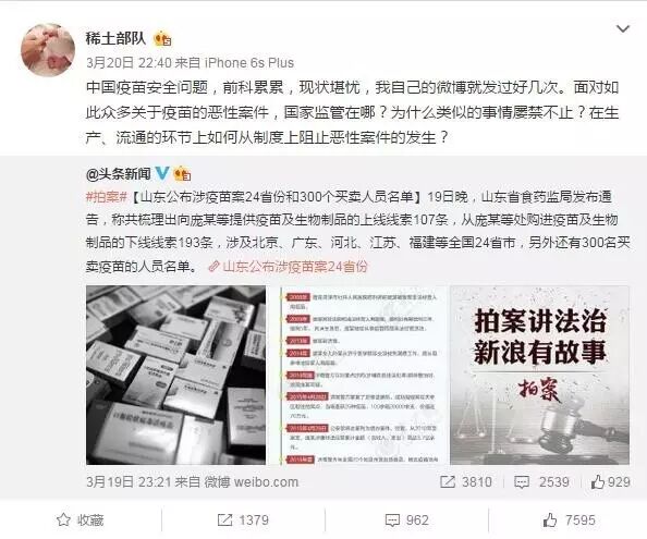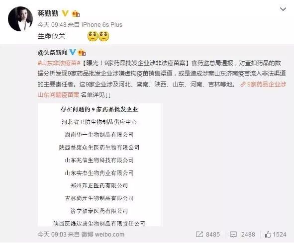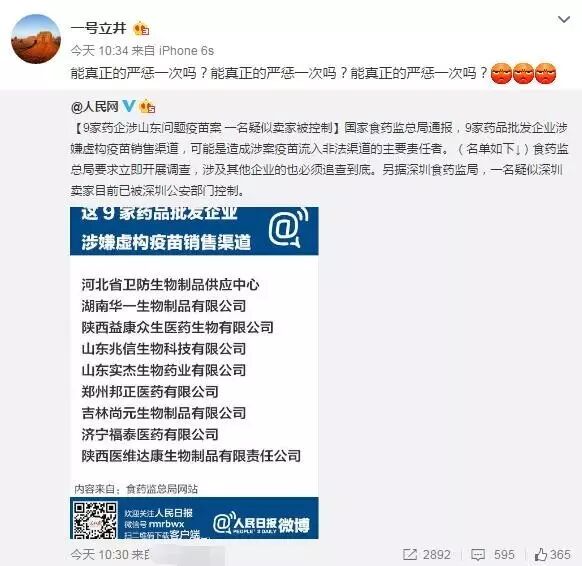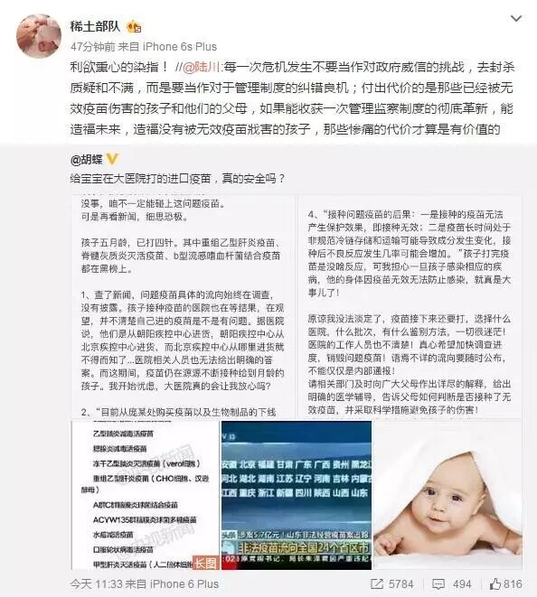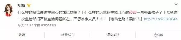 胡静表示:“什么样的贪欲连这样黑心的钱也敢赚?!什么样的玩忽职守能让问题疫苗一再毒害孩子?!希望这一次监管部门严格查清问题所在,严惩涉事人员!!!『疫苗之殇!震惊!』”