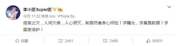 李小璐在微博呼吁真实的数据:“疫苗之灾,人间灾难,人心泯灭,制假药者良心何在!求曝光,求真实数据!求国家保护!”