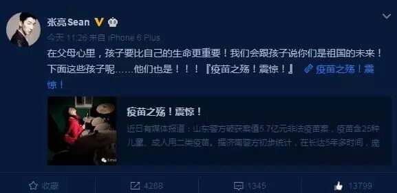 张亮于3月22日中午转发相关新闻,并发文称:“在父母心里,孩子要比自己的生命更重要!我们会跟孩子说你们是祖国的未来!下面这些孩子呢……他们也是!!!『疫苗之殇!震惊!』”