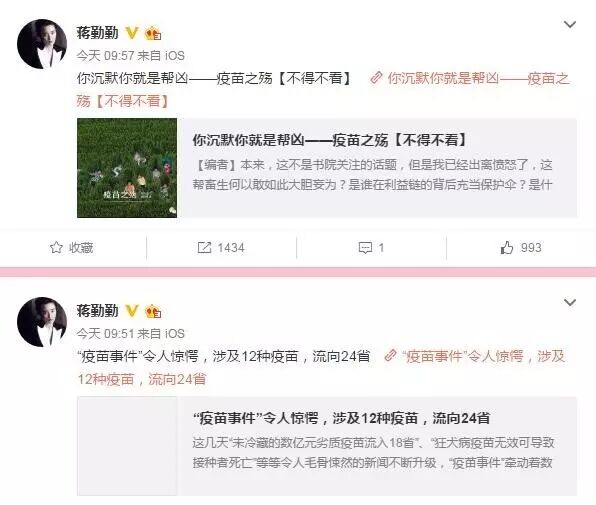 稍后,贾乃亮再次转发更新微博,并质问道:“好几百人,卖了6年,大半个中国,以后能不能活了?我就问?狂犬疫苗、流感疫苗,儿童该打的疫苗都造假,28度的疫苗运输温度 最后放在30几度的仓库,有的药预热变质会直接成为毒,最后打入人体,太可怕了,卖假药的,你们是疯了吗?”