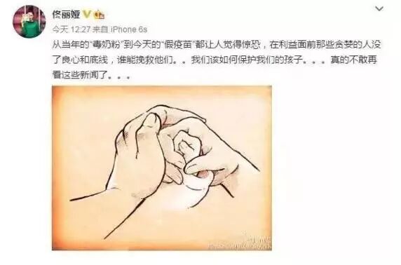 3月22日中午,佟丽娅发了一个大手牵小手的照片,并配文称:“从当年的“毒奶粉”到今天的“假疫苗”都让人觉得惊恐,在利益面前那些贪婪的人没了良心和底线,谁能挽救他们。。我们该如何保护我们的孩子。。。真的不敢再看这些新闻了。。。”