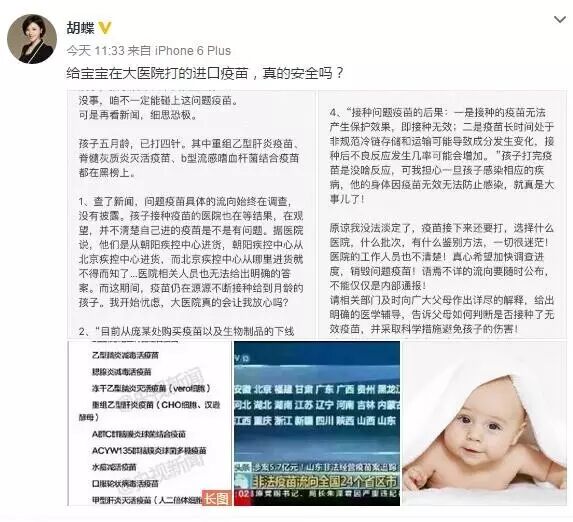 胡蝶3月22日发了一组图片,图片中的文字对疫苗事件进行了详尽的分析。也表达了自己对于疫苗安全问题的担忧。
