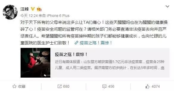 汪峰在网上发文称:“对于天下所有的父母来说这多么让TA们痛心!这些天醒醒妈也在为醒醒的健康操碎了心!疫苗安全问题的监管何在?请相关部门务必要查清非法疫苗去向并且严惩责任人。希望醒醒和所有疫苗接种期的孩子们都能够健康成长,也向忙碌的儿童医院的医生护士们致敬!”