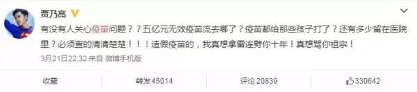 3月21日,奶爸贾乃亮也通过微博质问,称有没有人关注疫苗问题,并气愤的爆粗口,引网友力挺支持。他在网上发文道:“有没有人关心疫苗问题??五亿元无效疫苗流去哪了?疫苗都给哪些孩子打了?还有多少留在医院里?必须查的清清楚楚!!!造假疫苗的,我真想拿雷连劈你十年!真想骂你祖宗!”